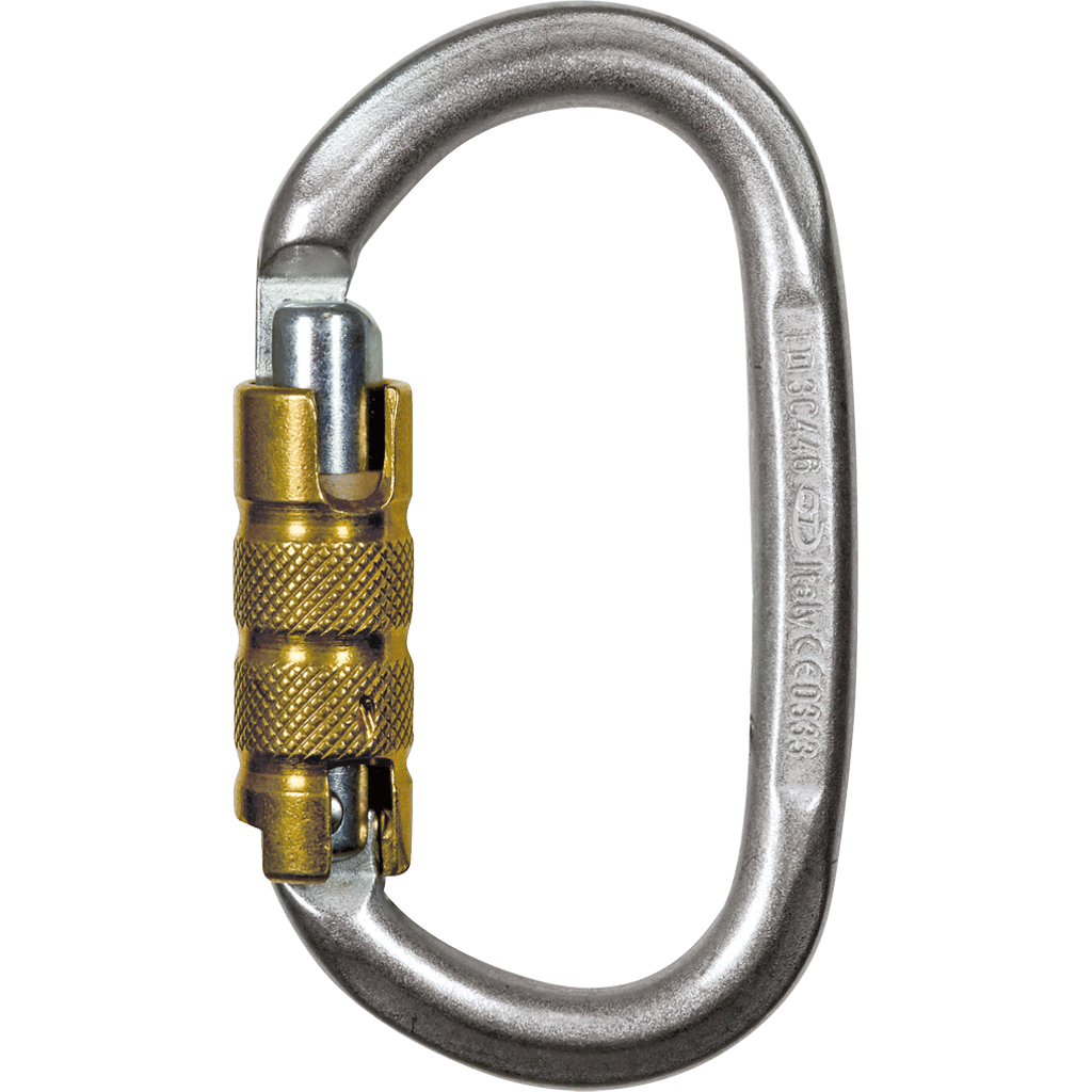 Conector oval de acero galvanizado con cierre automático triplex, ideal para el uso en ambientes difíciles y especialmente adecuados para la creación de anclajes o para usarse con dispositivos de gran sección (p. ej. poleas, bloqueadores y anticaídas deslizantes, etc).